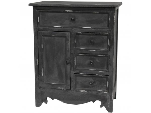 Large cabinet with mitered frame drawer faces and cabinet door. Features one wide drawer, three smaller drawers, and a large cabinet with magnet closure, all with painted black wood pulls. Unique carved apron stylistically balances simple flat top and frame. Matte black finish with white marking accents along edges and top surface make cabinet equally suited to traditional and more modern, eclectic interiors.